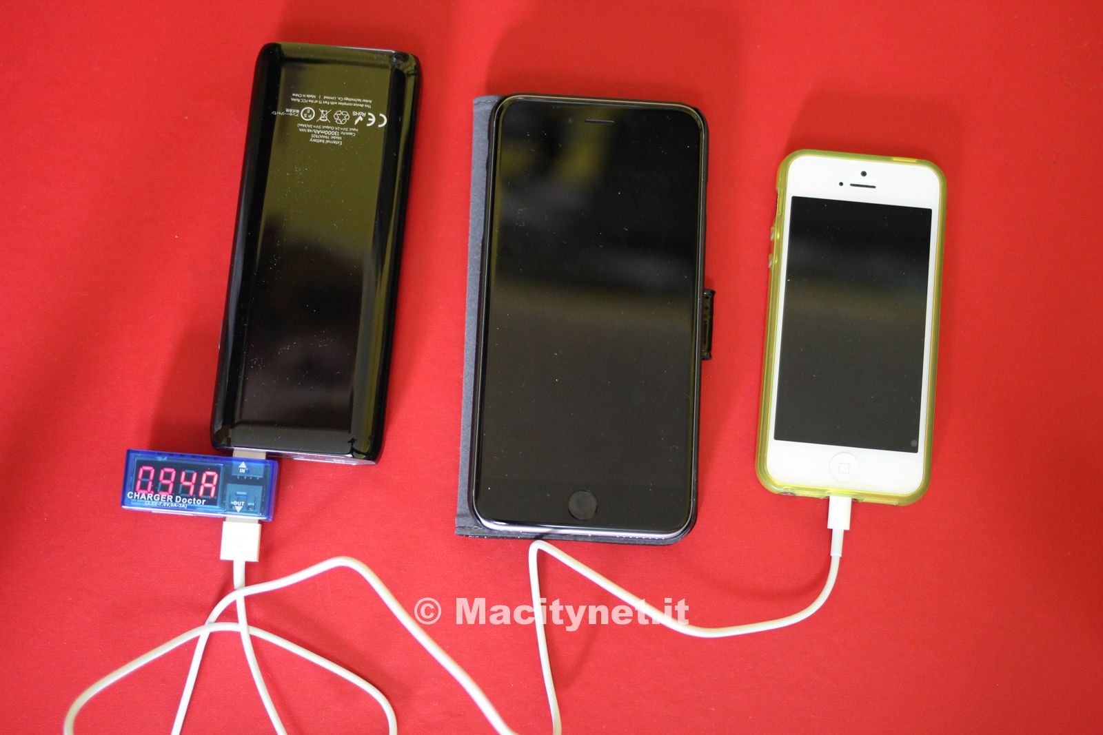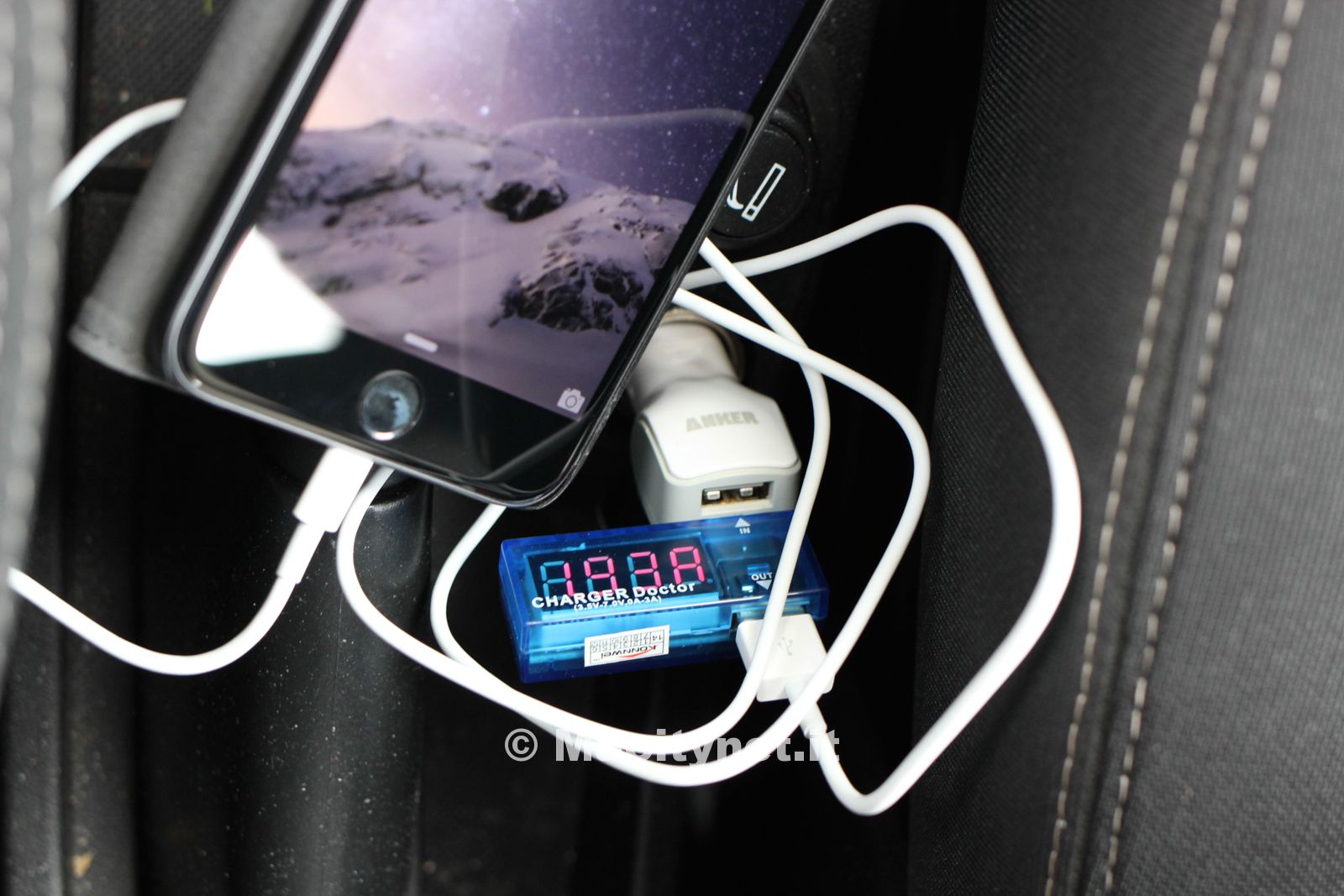 Anche una batteria Astro A4 da 13.000 mAh di Anker, di cui pubblicheremo presto una recensione, fa un ottimo lavoro: 1,69 A per iPhone 6 Plus e 0,94 A per iPhone 5. I risultati migliori li abbiamo però ottenuti in auto, testando tre diversi caricatori per presa accendisigari: quello Aiino recensito qui ad esempio ricarica il nostro iPhone 6 Plus a 1,94 A, simile quello di Anker di cui abbiamo pubblicato una recensione qui in quanto ricaricava il nostro telefono a 1,93 A. Per finire, il caricatore da auto Macally con due USB da 2,1 A ciascuna ricarica l’iPhone 6 Plus a ben 1,96 A.