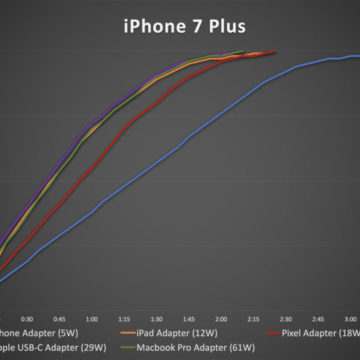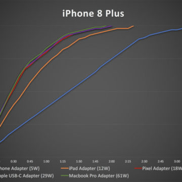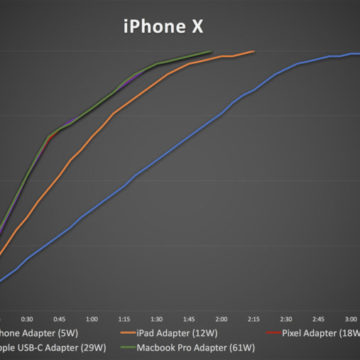 MacWorld aveva eseguito lo scorso anno alcuni test con vari alimentatori, incluso quello da 5W di serie con gli iPhone, quello dell’iPad (12W), l’alimentatore USB-C (29W) dei MacBook, da 61W dei MacBook Pro 15″ e anche quello del Google Pixel.