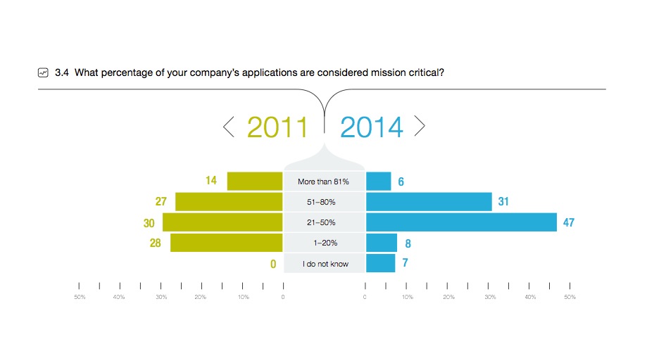 Secondo lo studio, negli ultimi tre anni il numero di decisori IT che ritiene che la propria azienda abbia più applicazioni di quante in realtà ne necessiti è passato da poco più di un terzo (34%) a quasi la metà (48%). Solo il 37% crede che la maggior parte delle loro applicazioni siano mission-critical. Quasi tre quarti (73%) ritiene che almeno un quinto delle proprie applicazioni aziendali abbiano funzionalità simili e che dovrebbero essere razionalizzate e il 57% ritiene che un quinto di queste siano da eliminare o sostituire.