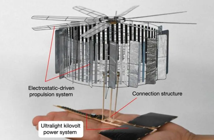Di questo particolare drone si parla in un articolo scientifico di Nature, spiegando che sfrutta un motore elettrostatico che pesa solo 1,52 grammi ed è alimentato con celle solari in grado di produrre 4,5V (pannelli solari ultraleggeri riescono a convertire in energia elettrica oltre il 30% della luce solare).