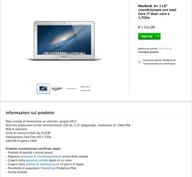 Ricordiamo che i prodotti ricondizionati Apple Store online sono pari al nuovo per estetica e funzionalità e sono forniti con la garanzia Apple di 1 anno, con possibilità di estensione con Apple Care. Per visualizzare i Macbook Air ricondizionati è possibile partire da qui, mentre gli iPod touch ricondizionati da qui.