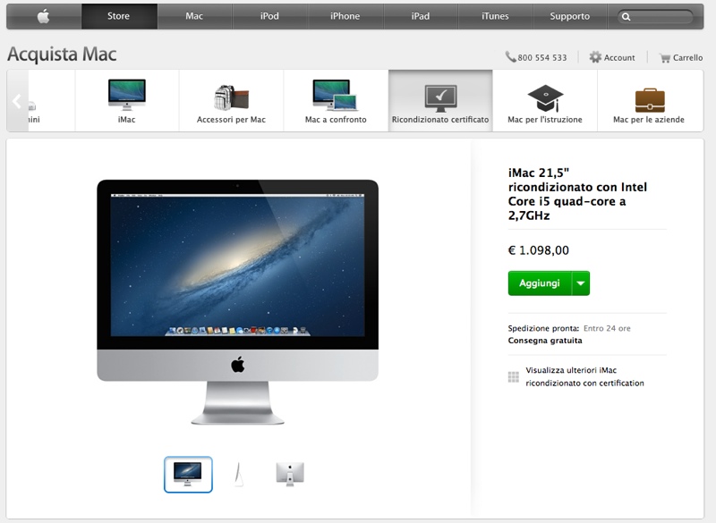 iMac 21,5” del 2012 ricondizionato a partire da 1.098 euro: è una delle numerose configurazioni disponibili nella sezione ricondizionati di Apple Store oline. Si tratta di uno dei prezzi più bassi in circolazione per acquistare l’elegante e sottilissimo desktop all-in-one della Mela, escludendo ovviamente il mercato dell’usato, meno sicuro e meno garantito.