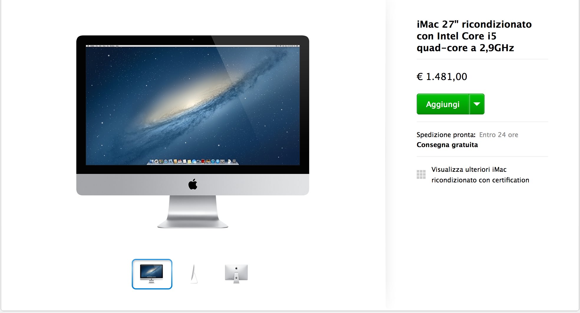 iMac 21,5” del 2012 ricondizionato a partire da 1.269 euro e iMac 27 pollici sempre del 2012 a partire da 1.481 euro. Ecco due delle occasioni che troviamo su Apple Store, nella sezione ricondizionati.