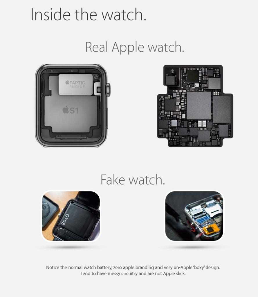 Se siete di fronte ad un falso realizzato ad arte, non vi resta che aprire Apple Watch ed osservare le componenti: nel caso dell’orologio originale le componenti sono marchiate Apple e strutturate ordinatamente nella cassa dello smartwatch; i falsi invece mostrano componenti generiche e un groviglio inestricabile di pezzi assemblati.