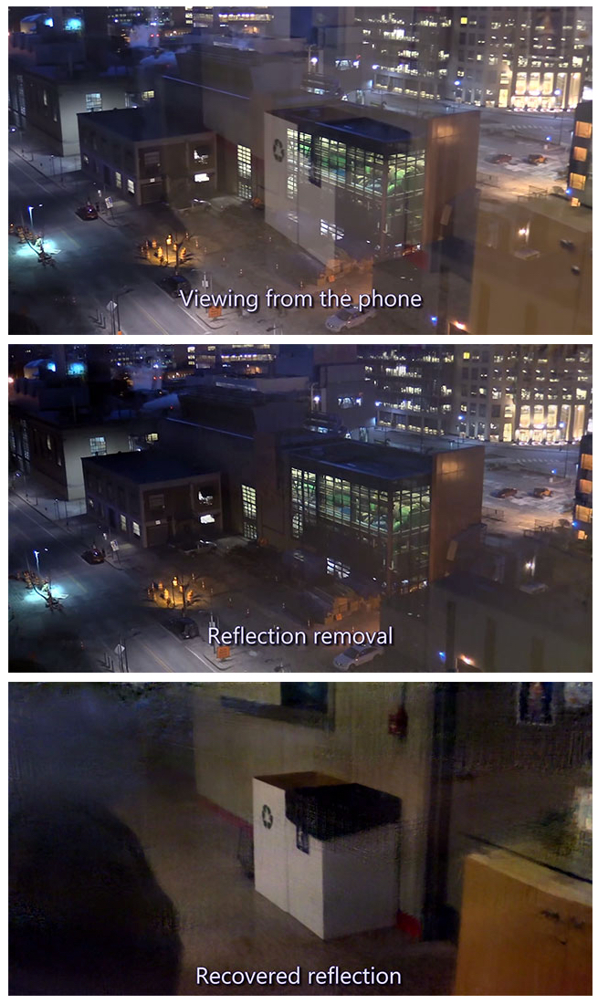 Analizzando così i diversi scatti l’algoritmo è in grado di definire il rapporto dimensionale fra gli elementi dell’immagine e i riflessi (o gli oggetti che ostruiscono la vista), isolandoli e rimuovendoli dall’immagine finale.