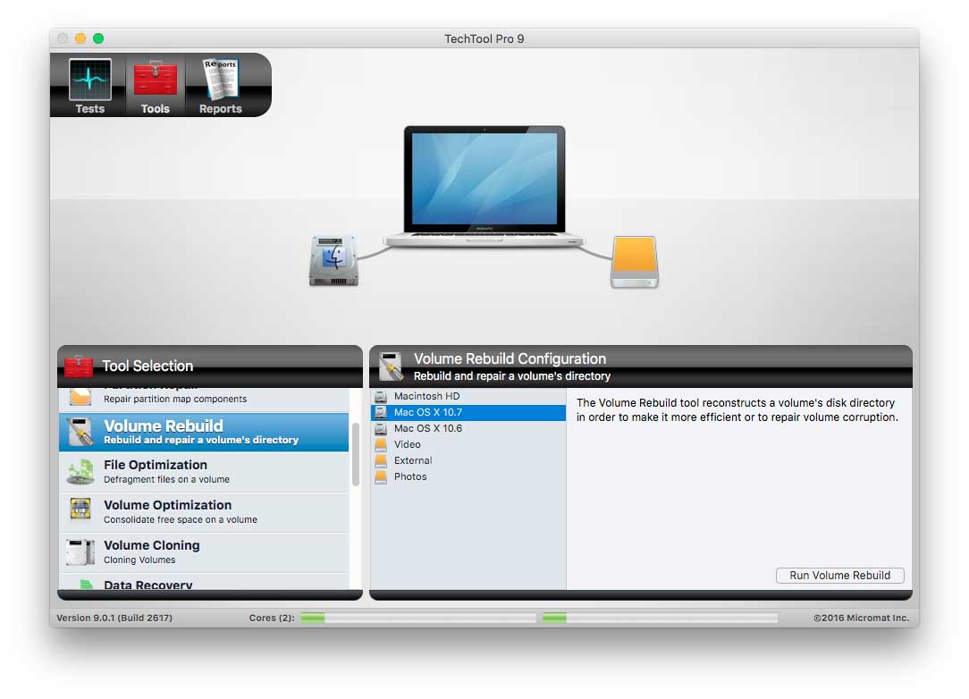 Non è una vera e propria utility per la riparazione dei dischi ma un insieme di test per verificare la “salute” del Mac. TechTool (94,45€ nel momento in cui scriviamo) mette in ogni caso a disposizione una serie di tool per riparare i volumi, non solo Mac ma anche Windows. Uno strumento consente di riparare le partizioni, correggere errori e la funzione “Volume Builder” consente di correggere sia la struttura di unità HFS/HFS+, sia di unità APFS (non sono ad ogni modo supportati dischi RAID non Apple).