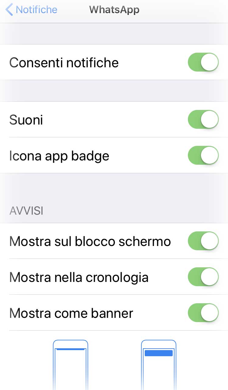 Se non volete disattivare tutte le notifiche, potete farlo per specifiche app (utile se pensate che l’idiota di turno potrebbe mandarvi un messaggio sull’app in questione). Per farlo basta andare in Impostazioni > Notifiche, selezionate l’app di vs interesse (es. WhatsApp) e disattivate l’opzione “Consenti notifiche”. Scorrendo in basso è possibile scegliere se mostrare o no le anteprime. Anche in questo caso ricordiamo che bisognerà ovviamente ripristinare le notifiche non appena Apple rilascia l’aggiornamento di iOS con il fix per il bug.