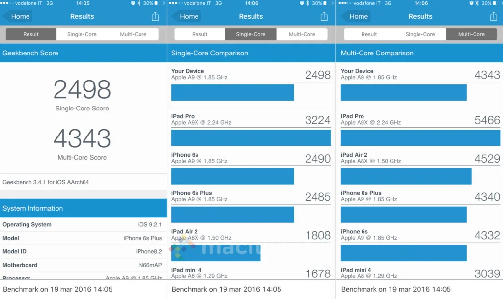 A piena potenza, guardando i numeri del più recente iPhone 6s Plus si scopre che il dispositivo raggiunge punteggi ragguardevoli di 2498 e 4343, rispettivamente per single-core e multi-core. I risultati parlano chiaro, con questi punteggi, iPhone 6s Plus risulta inferiore soltanto ad un iPad Pro in single core, mentre sul versante multi core, si trova anche poco sotto ad iPad Air 2.