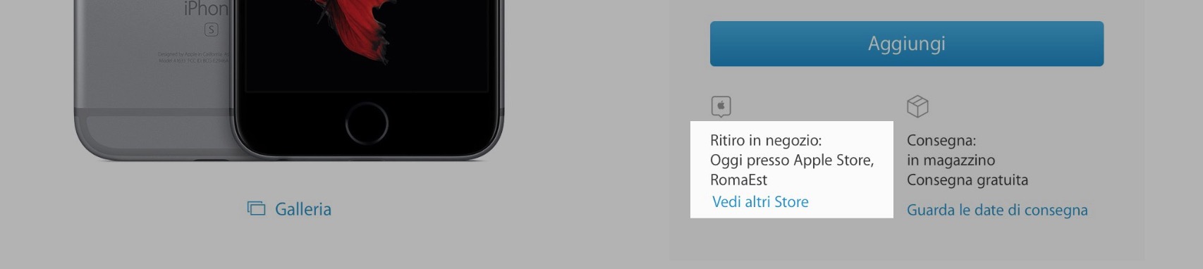 Se invece è già stato selezionato un Apple Store in precedenza, sulle pagine di prodotto apparirà l’indirizzo scelto. E’ comunque possibile cliccare su “Vedi altri Store” per verificare la disponibilità per il ritiro presso un altro negozio.