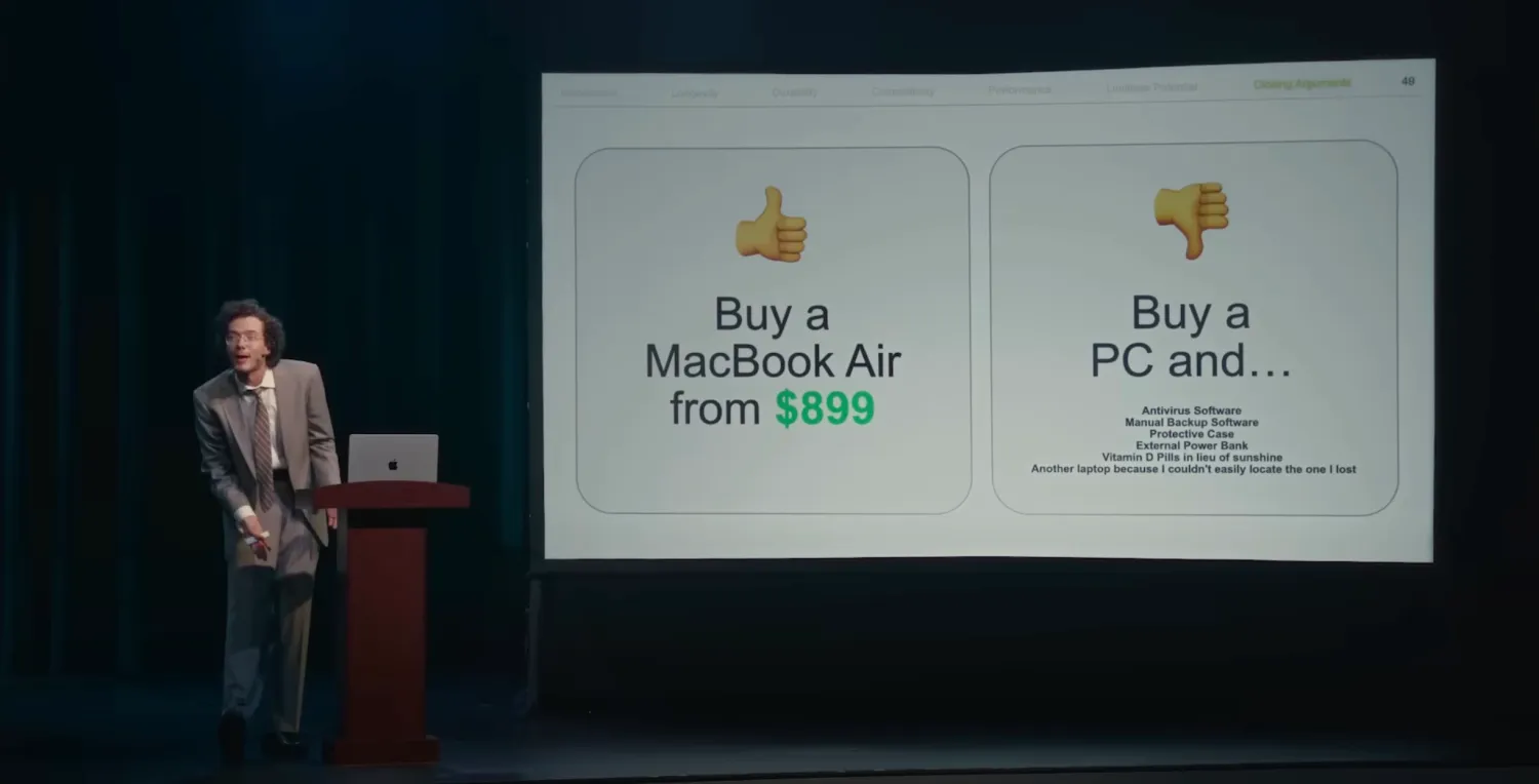 Protagonista del video è il comico americano Martin Herlihy, nel ruolo di un relatore che guida gli studenti nel confronto tra Mac e PC Windows, toccando sia i costi nascosti (antivirus, software di backup, accessori) sia l’affidabilità del sistema. In una scena, Herlihy inscena un finto panico davanti alla celebre Blue Screen of Death, per poi rassicurare: “Tranquilli, succede solo su un PC.”