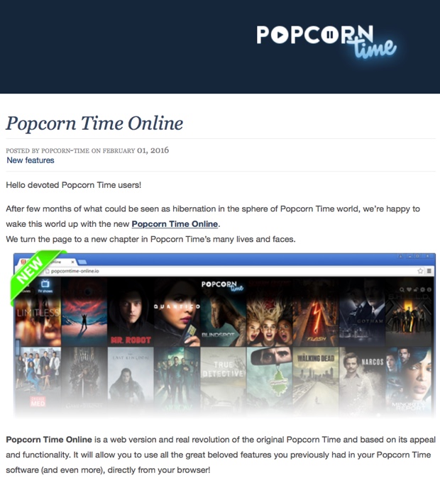 Il team di Pocorn Time non riposa: dopo i client per computer e l’app non autorizzato per iOS, il software che riproduce film e video Torrent in streaming, torna con il nuovo Popcorn Time Online. Questa volta gli sviluppatori dichiarano che “Sono tornati per restare”, in riferimento alle non poche azioni legali e cause che hanno preso di mira anche alcuni utenti che hanno impiegato Popcorn Time per riprodurre film e contenuti protetti da diritti.