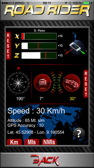 Ideale sia in auto che in moto, Road Rider offre tre funzioni principali: Monitor, Chrono Test e Logbook. Con Monitor possiamo misurare e controllare in tempo reale la velocità a cui viaggiamo, l’altitudine, le forze G esercitate sul veicolo e anche sul nostro corpo sugli assi di beccheggio, rollio e imbardata o ancora controllare la latitudine e longitudine e la bussola.