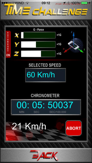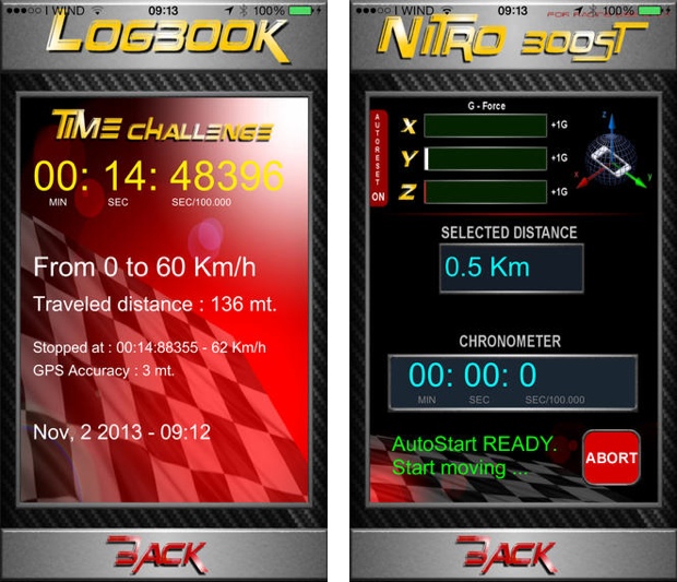 L’impiego completo dei principali sensori di iPhone però risulta ancora più funzionale grazie agli strumenti della sezione Chrono Test che permettono di misurare le prestazioni in due diverse competizioni: Time Challenge e Nitro Boost. Nel primo caso misureremo il tempo impiegato per giungere la velocità selezionata (da 10 a 300 chilometri orari, miglia orarie o nautiche), mentre nel secondo caso misureremo il tempo impiegato per raggiungere la distanza selezionata (fino a 300 metri).
