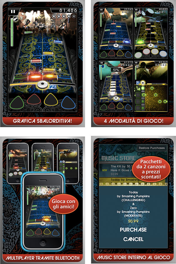Il fenomeno Rock Band non poteva mancare sui dispositivi tascabili più richiesti dagli utenti: ora grazie a Electronic Arts gli appassionati di Rock Band possono mettere alla prova le proprie qualità di rock star da soli o in cooperazione fino a 4 amici sempre e ovunque con iPhone e touch. Il gioco include 20 canzoni che è possibile suonare in quattro modalità diverse: basso, chitarra, batteria e anche voce, inoltre giocando in single player è possibile affrontare una sfida lampo con una sola canzone oppure cimentarsi nella modalità carriera completa. A partire dalle bettole e man mano che suoneremo meglio, avremo a disposizione più soldi, più pubblico fino a riempire interi stadi.