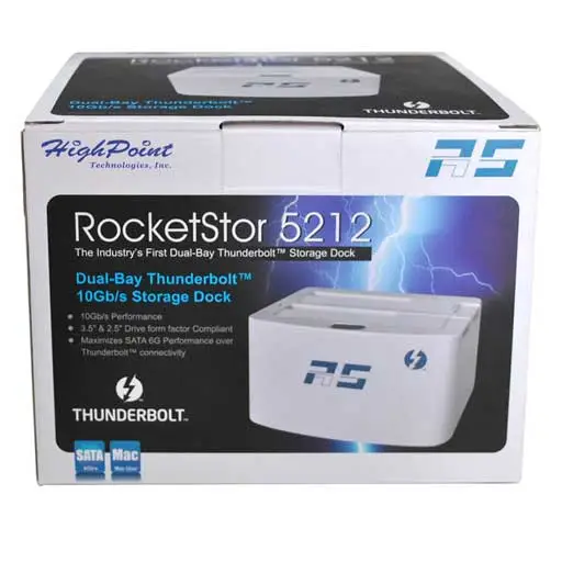 La disponibilità di dischi Thunderbolt è ancora scarsa ma con RocketStor 5212 di HighPoint possiamo aggirare questo problema. Si tratta do una dual docking station Thunderbolt, di fatto un pratico adattatore che consente di accedere contemporaneamente a due dischi rigidi SATA da 2.5” oppure 3.5” direttamente dal computer tramite l’interfaccia che Apple sta spingendo massicciamente. I dischi s’inseriscono nella parte superiore dell’unità che rimane sempre collegata al computer. Il dispositivo offre velocità di trasferimento teoriche di 10GB/s ed è comodo per l’utilizzo nel media editing, la riproduzione di video HD e per eseguire backup ad alta velocità da disco a disco.