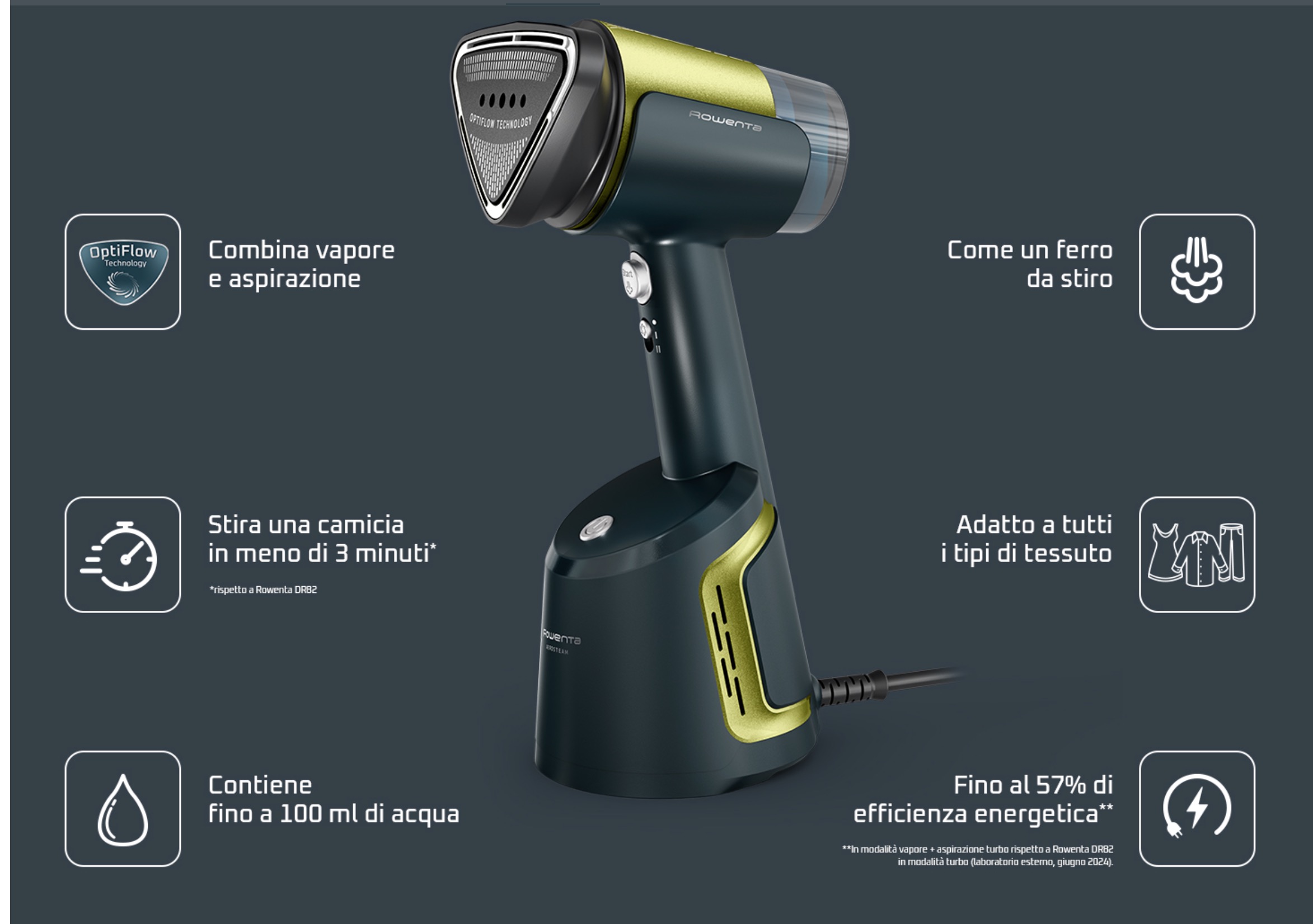 Il Rowenta AeroSteam unisce vapore ad alta pressione e aspirazione attiva per tendere i tessuti e migliorare l’efficacia della stiratura verticale. Il sistema riduce le pieghe più ostinate su camicie, abiti e tendaggi senza bisogno di un’asse da stiro. Il vapore continuo ammorbidisce le fibre, mentre l’aspirazione le mantiene in posizione, consentendo un risultato più preciso e veloce. Il design verticale ne facilita l’uso anche in piccoli spazi.