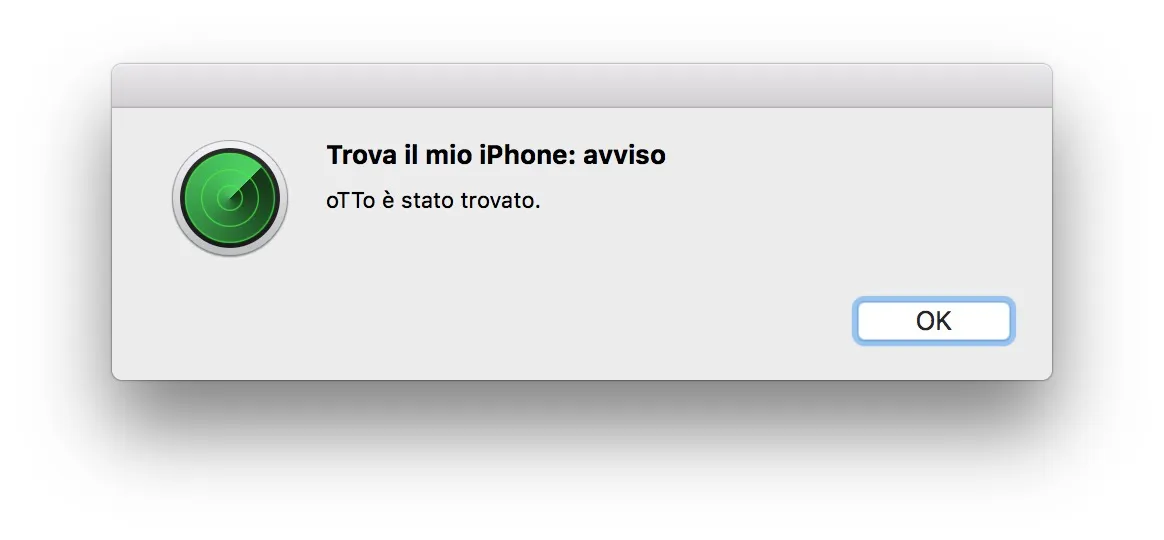 Il nome dell’iPhone riportato «IPhone 8 Space Gray», oltre che scritto sbagliato (IPhone e non iPhone, con un marchio che mai farebbe questo tipo di errore) è anche diverso dal nome che gli avevamo assegnato “oTTo”, che è attualmente lo stesso riportato su Trova il mio iPhone.