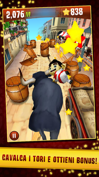 Sviluppato da Zynga ed eletto nel 2013 “Miglior gioco nell’App Store per la modalità multigiocatore”, può essere definito come un mix tra Temple Run e Subway Surfer, due endless runner ben noti tra i giocatori più incalliti su iDevice. Con un sottofondo musicale spagnoleggiante, dovremo infatti sfuggire dalle grinfie di un toro inferocito che ci rincorrerà per le vie della città schivando ostacoli attraverso le classiche gesture che contraddistinguono questa tipologia di giochi: uno swipe verso l’alto per saltare, uno verso il basso per scivolare ed uno ai lati per cambiare corsia oppure svoltare in prossimità di un incrocio.