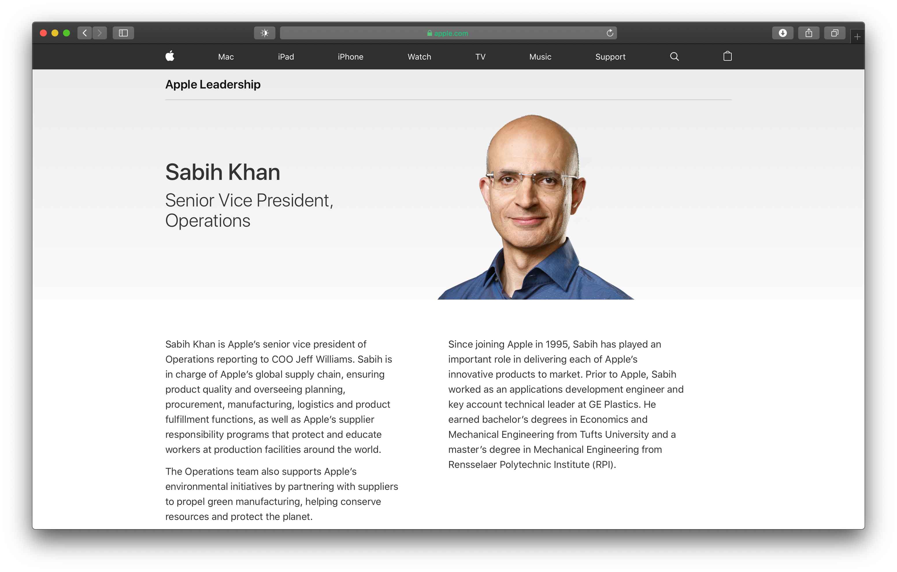 “Sabih guida le nostre operazioni con il cuore”, ha dichiarato il CEO Tim Cook. “Lui e tutto il suo gruppo mondiale sono impegnati per consentire di tenere fede a esperienze ineguagliabili per i nostri clienti, fre in modo che ovunque i lavoratori siano trattatti con dignità e rispetto, proteggere l’ambiente per le future generazioni”.