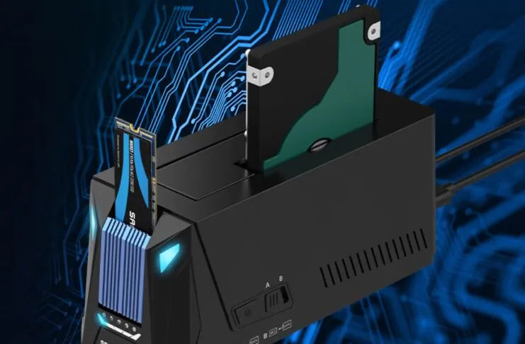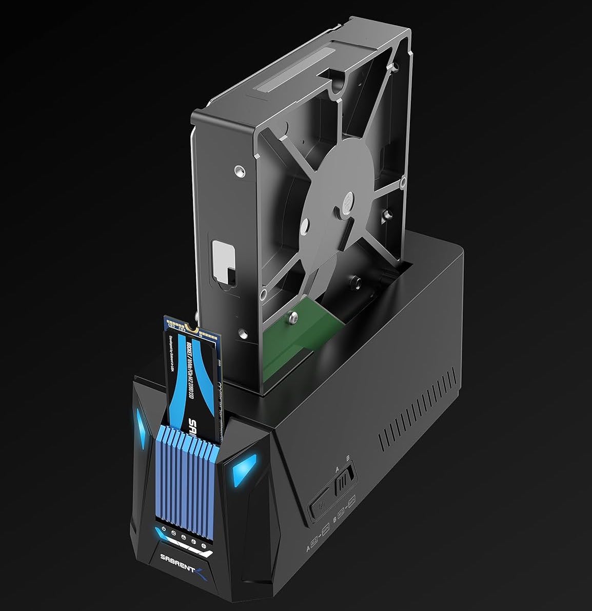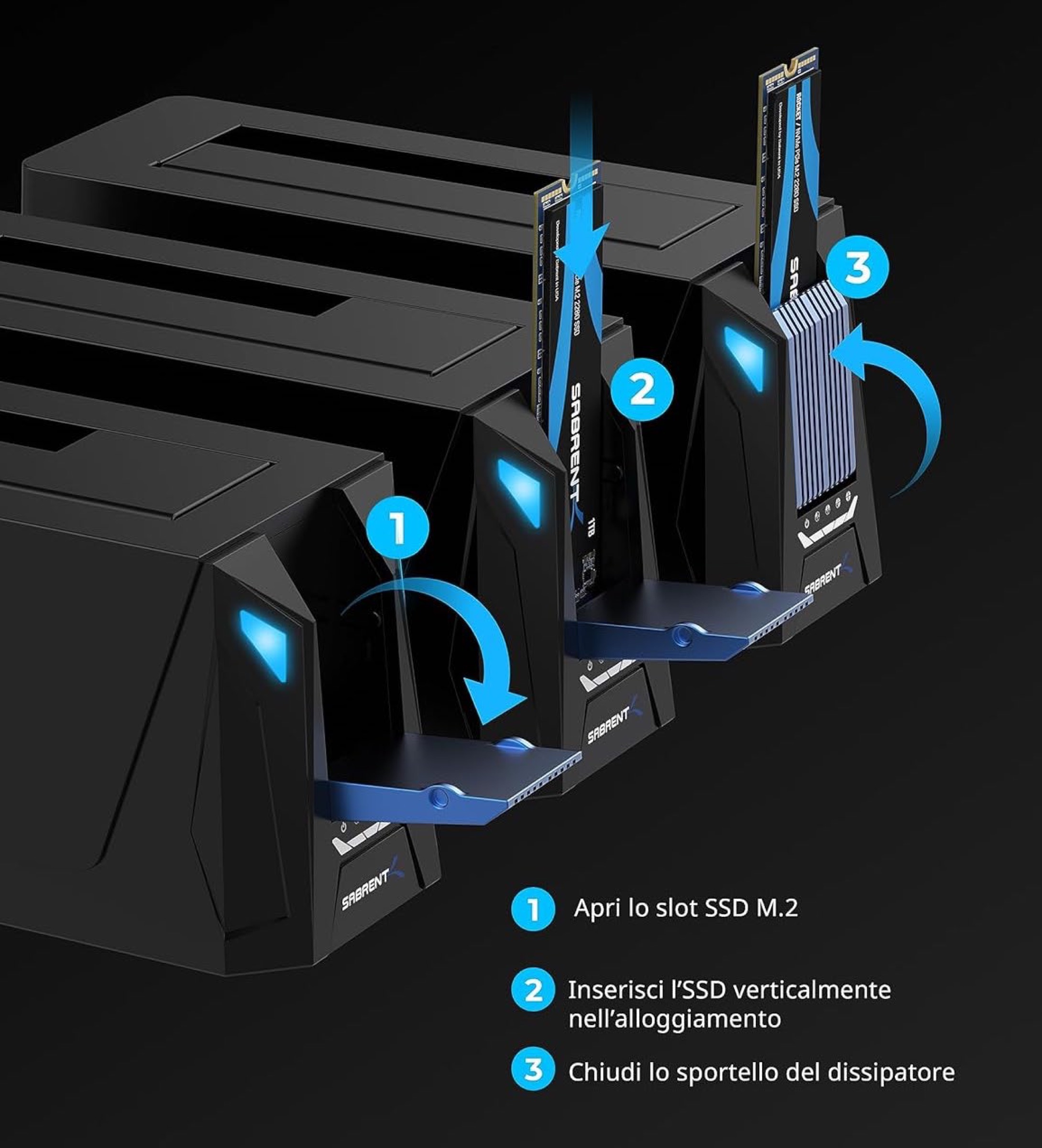 Se avete necessità di trasferire, copiare, clonare unità di memoria vecchie e nuove ccco la docking station USB-C che stavate cercando: quella di Sabrent infatti vi fa lavorare con dischi rigidi e SSD di formati diversi da un’unica postazione in quanto supporta unità SATA da 2,5″ e 3,5″ ma anche dischi SSD M.2 nei formati 2242, 2260 e 2280 (sia NVMe che SATA).