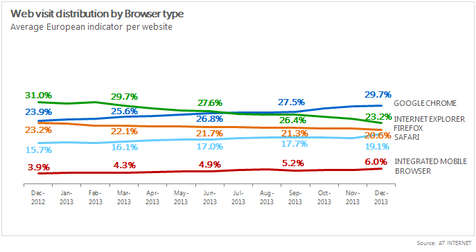 Lo studio ha preso in esame 23 Paesi differenti del Vecchio Continente, dando particolare risalto a Spagna, Francia, Germania e Regno Unito: nel complesso Safari ha raggiunto il 19.1% del mercato web, mentre Firefox scende al 20.6%. In seconda posizione Internet Explorer con il 23.2 per cento mentre in vetta resta Chrome con il 29.7%. Nell’andamento Chrome e Safari sono i due browser a crescere maggiormente, mentre Internet Explorer e Firefox perdono sempre più terreno.