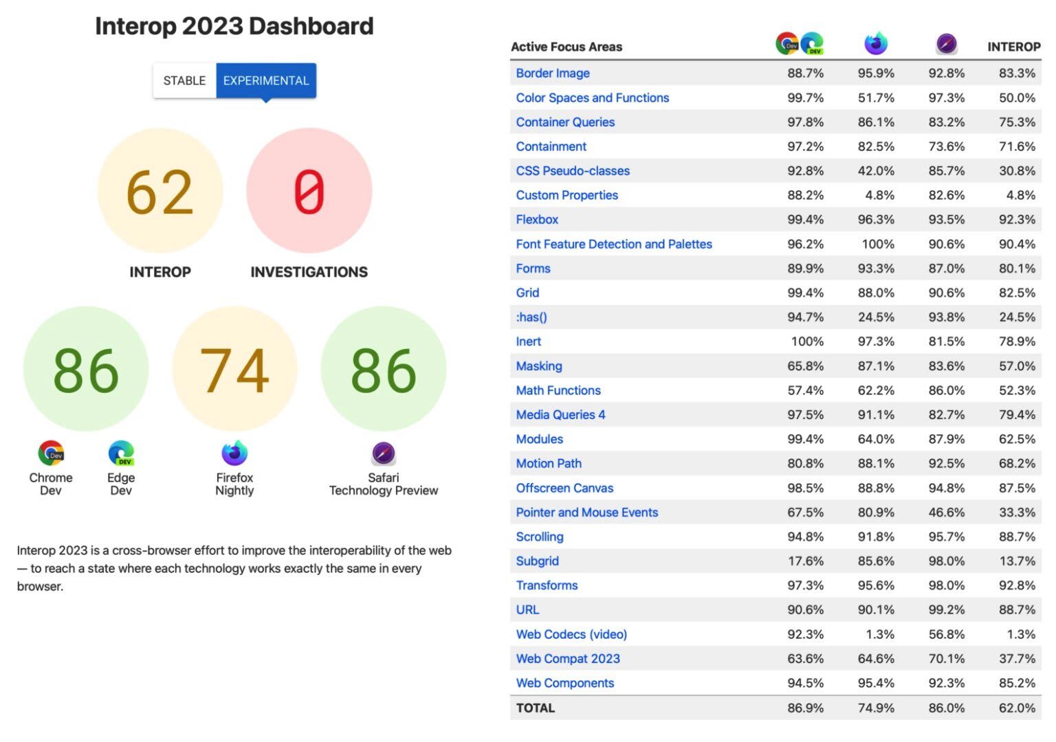 Lo scorso anno sono state effettuate valutazioni su differenti aspetti dei browser, incluso scrolling, moduli, codifica, tipografia, CSS e altro ancora. Quando il progetto è stato lanciato nel marzo 2022, Safari aveva ottenuto solo un punteggio di 50 su 100, mentre Chrome vanta un punteggio di 61 su 100 e Firefox di 69 su 100. La versione più recente di Chrome ora vanta 88 punti, Firefox 92 punti e Safari ben 98,2 punti.