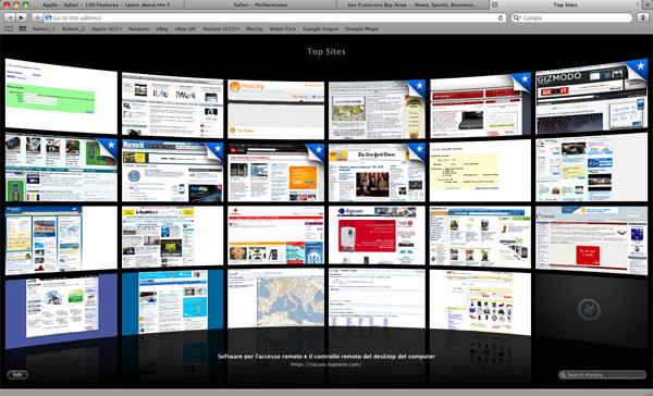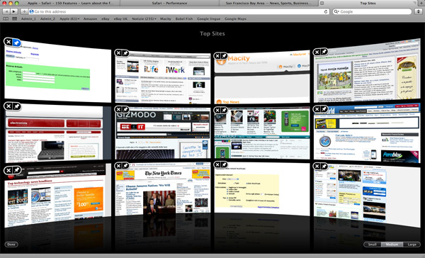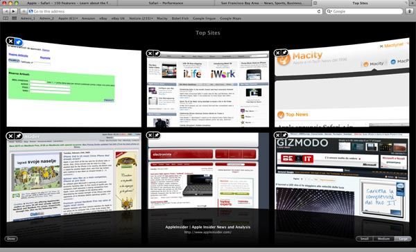 Il secondo nuovo pulsante di Safari 4 si trova nell’angolo in basso a sinistra: basta premerlo una sola volta per visualizzare i siti Web visitati con più frequenza dall’utente (Top Sites). Questa schermata visualizza le anteprime grafiche di ciascuna pagina Web, inoltre la vista può essere completamente personalizzata premendo il pulsante Edit in basso a sinistra. L’utente può selezionare la visuale Small, Medium e Large che permettono di visualizzare rispettivamente 24, 12 oppure solamente 6 anteprime, inoltre è possibile modificare anche la posizione.