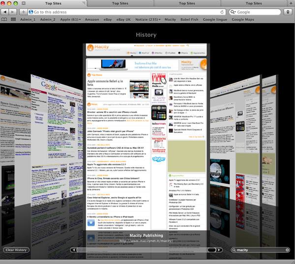 Le anteprime sono ora utilizzate anche nella visuale Cover Flow della pagine Web di tutti i nostri preferiti e anche nella sezione di ricerca. Qui è possibile navigare velocemente tra le anteprime della history o dei nostri preferiti, oppure inserire parole rilevanti per raggiungere più velocemente la pagina Web desiderata.