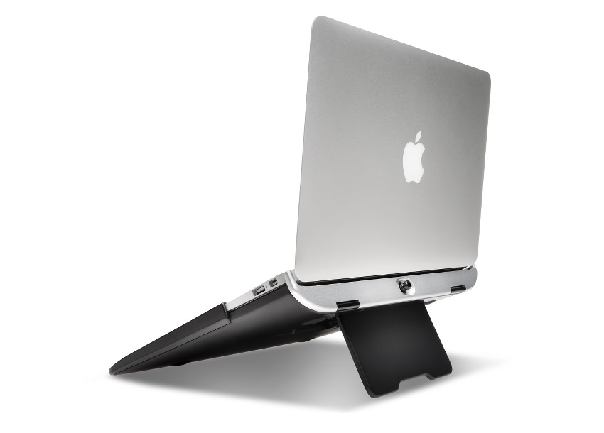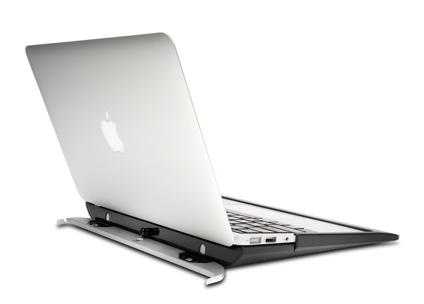 Questo accessorio è una sorta di piattaforma, sottile e leggera, con delle guide che bloccano il MacBook Air. Una volta inserito al suo interno il computer, si chiude la barra in alluminio posteriore che rivela un attacco Kensington. In questo modo diventa impossibile togliere il portatile dalla piattaforma che legata attraverso un cavo con lucchetto (incluso nella confezione) si trasforma in un antifurto per il computer.