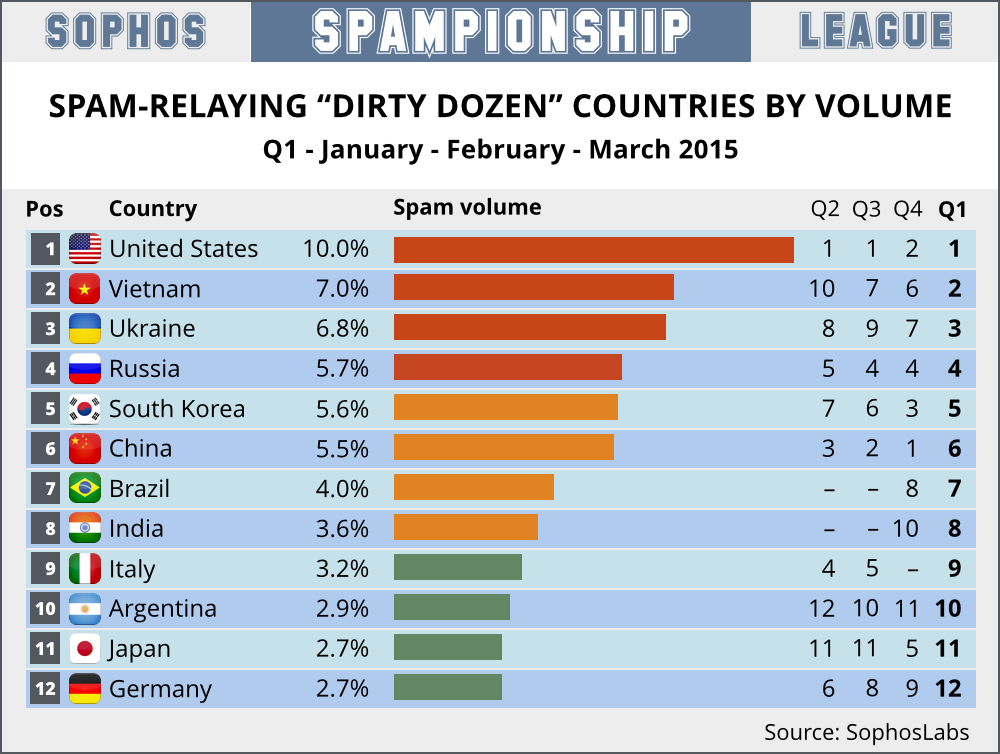 L’Italia risale la classifica della spam. È Sophos a mettere il nostro paese in salita nella poco onorevole  classifica dello spam relativa al primo trimestre 2015, nota come “SPAMPIONSHIP”.