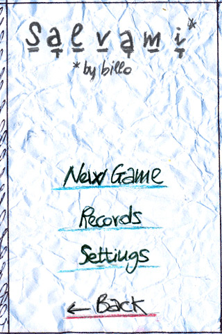 Al primo avvio Salvami visualizza sullo schermo del nostro tascabile un foglio di carta con una riproduzione talmente fedele del gioco su carta e penna da includere persino pieghe e stropiccii. Anche i disegni stilizzati sembrano realizzati a mano con pastelli colorati: lo scenario è quello classico con pali di legno, cappio e omino che vengono disegnati man mano che sbagliamo una lettera nella parola da indovinare.