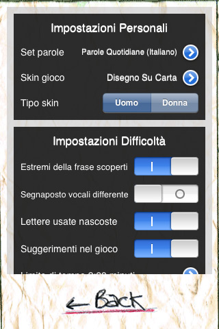 Dal pannello Setting possiamo innanzitutto scegliere se giocare con parole italiane o inglesi scegliendo per ognuna delle due lingue paesi e città , titoli di film, parole quotidiane e infine anche personaggi famosi, quest’ultimo solo per parole italiane. Oltre al tempo disponibile per indovinare la parola possiamo nascondere o visualizzare gli estremi, attivare dei segnaposto per le vocali, impostare la lunghezza minima e massima delle parole e molto altri.