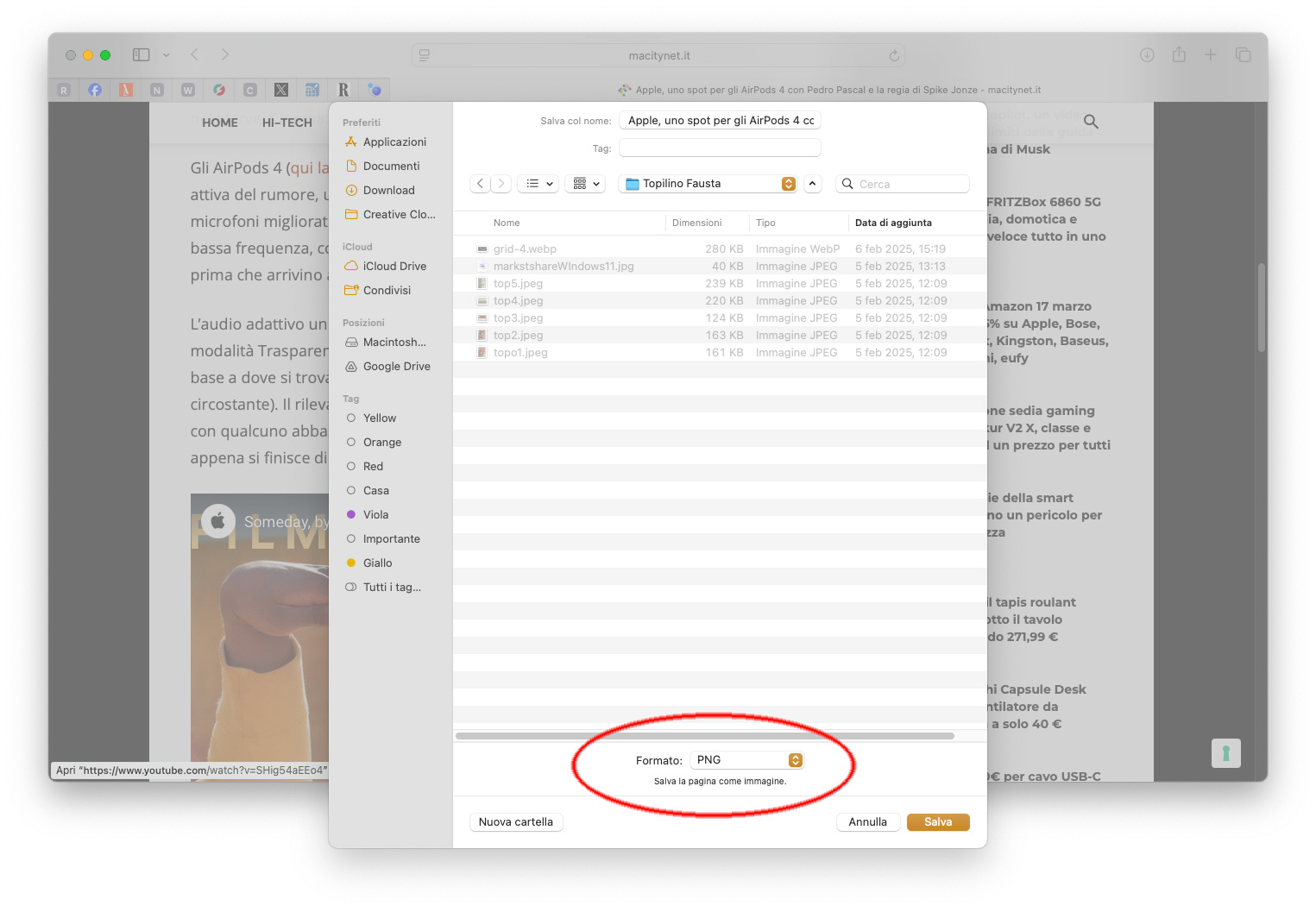 Una funzione non a tutti nota attiva da un po’ di tempo con gli ultimi aggiornamenti permette di selezionare dal menu “File” di Safari la voce “Salva con nome” e da qui anziché selezionare “Sorgente pagina” o “Achivio web”, scegliere il formato PNG.