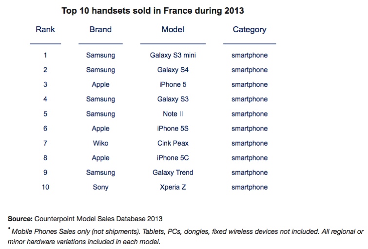 In Francia nella top 10 dei dieci smartphone più venduti sono solo due i modelli non prodotti né da Samsung né da Apple, ovvero il Wiko Cink Peax (uno smartphone Android a basso costo) e il Sony Xperia Z; il resto della classifica è occupato da cinque dispositivi Samsung e tre dispositivi Apple, con Samsung Galaxy S3 Mini, Samsung Galaxy S4 e Apple iPhone 5 ad occupare rispettivamente le prime tre posizioni.