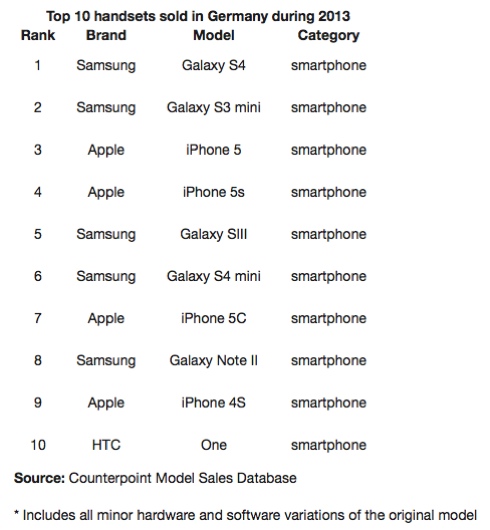 Ancora più schiacciante il duopolio nella top 10 tedesca, dove tutte le prime nove posizioni sono occupate da quattro dispositivi Apple e cinque apparecchi Samsung, con il solo HTC One a fare timidamente la sua comparsa in decima e ultima posizione. Anche in Germania sono Samsung Galaxy S4 e Samsung Galaxy S3 Mini gli smartphone più venduti, mentre Apple iPhone 5 occupa nuovamente la terza posizione della classifica.
