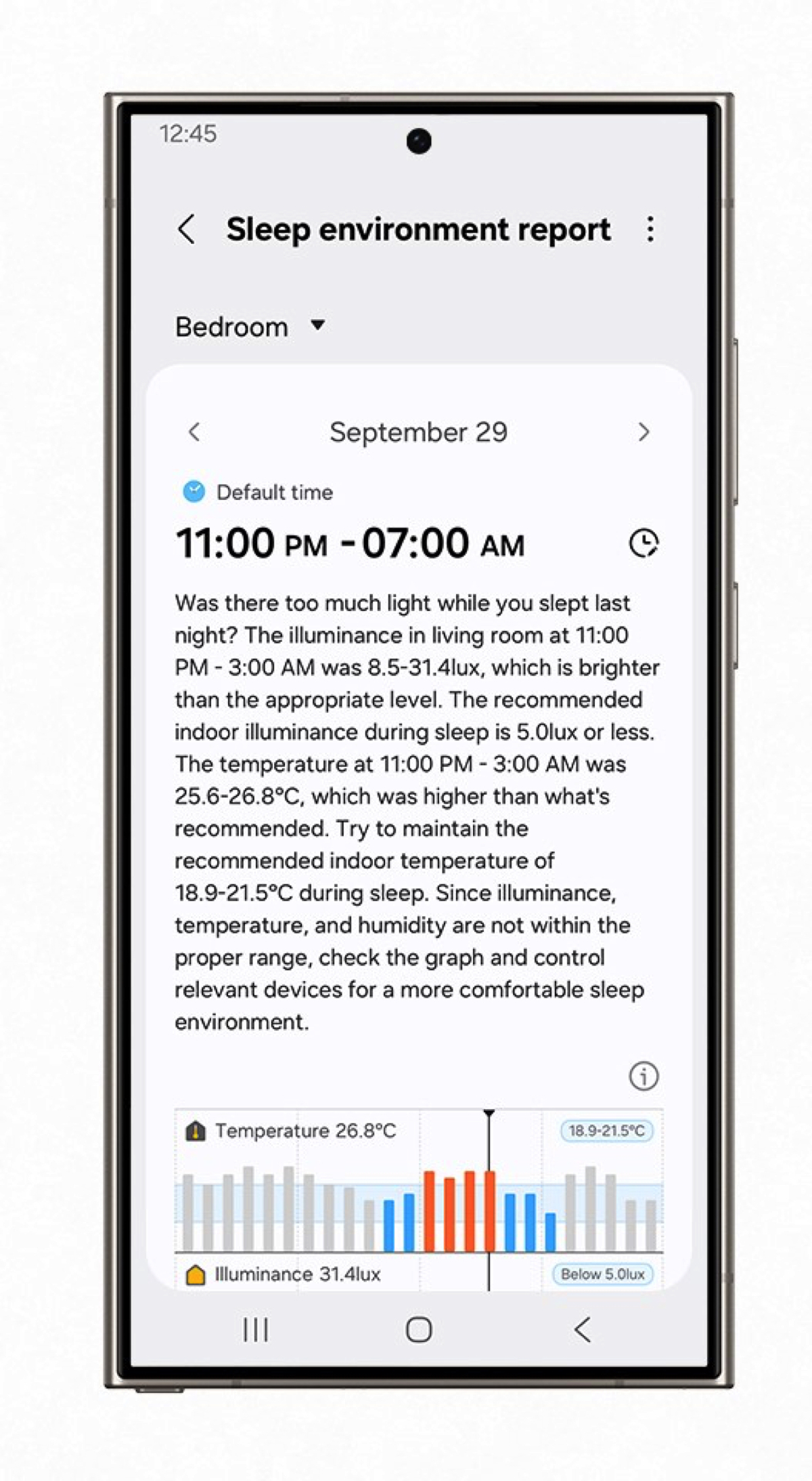 Anzitutto, Samsung Health riceverà nuove funzionalità avanzate per migliorare la qualità del sonno e il benessere mentale. Tra queste, la possibilità dell’analisi dell’ambiente, grazie alla quale ci sarà l’integrazione dell’anello con altri dispositivi SmartThings per valutare temperatura, umidità, qualità dell’aria e luce nella stanza.