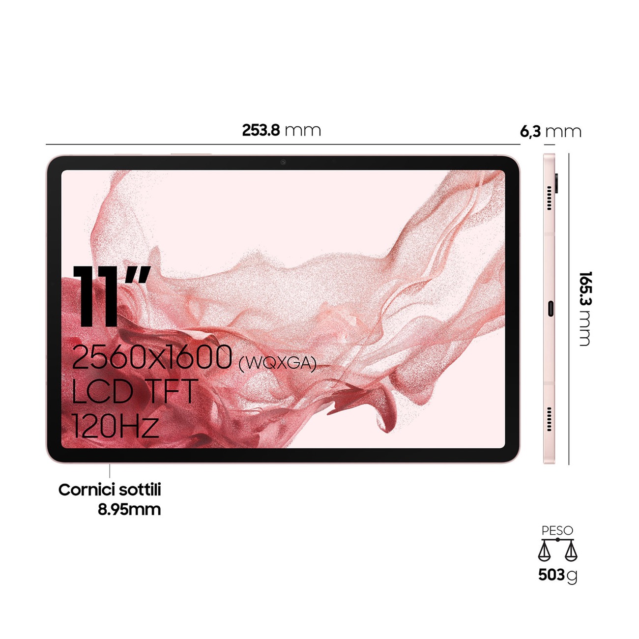 Il modello Galaxy Tab S8 è il più piccolo dei tre: ha uno schermo da 11 pollici con risoluzione 2.560 x 1.600 pixel, mentre S8 Plus ha uno schermo da 12.4″ con risoluzione pari a 2.800 x 1.752 pixel. Infine il modello top Galaxy Tab S8 Ultra invece ha un enorme schermo da 14.6 pollici (con tacca) con risoluzione di 2.960 x 1.848 pixel. Inoltre Plus e Ultra montano un pannello OLED, mentre S8 ha uno schermo LCD.