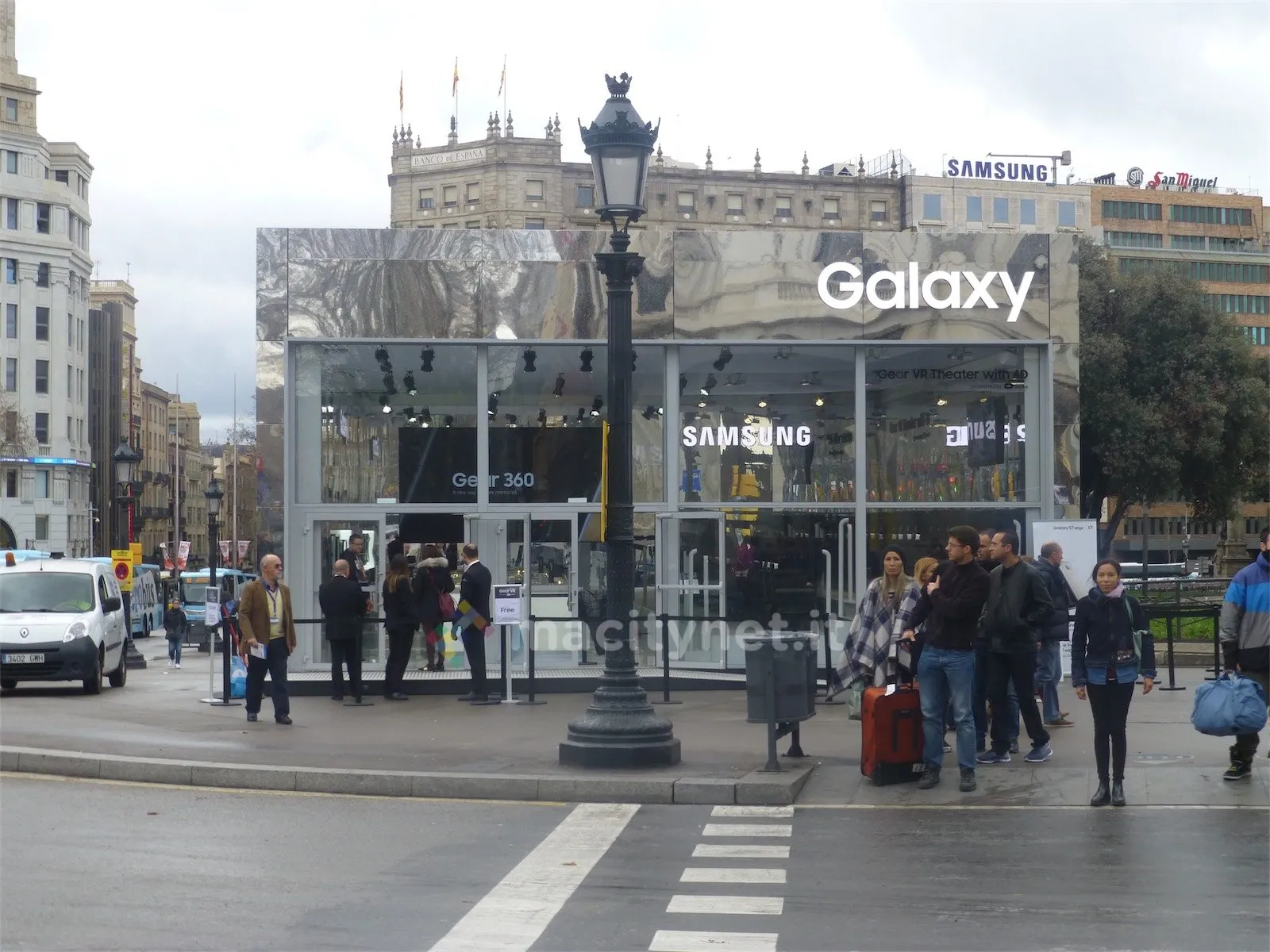 La struttura di Samsung con pianta rettangolare è coperta a specchio su tre lati, un richiamo al retro di Galaxy S7, mentre sul lato posteriore bianco spicca una gigantografia del nuovo smartphone. Non fatevi ingannare dalla piazza deserta e dalle transenne spopolate: le foto di Macitynet sono state scattate poco dopo le 8 del mattino, un orario improponibile per i weekend infuocati di Barcellona. Già ben prima dell’apertura delle ore 10 decine di persone attendevano in fila sotto la pioggia per poter provare Galaxy S7 e il visore Gear VR, stesso orario di apertura dell’Apple Store.