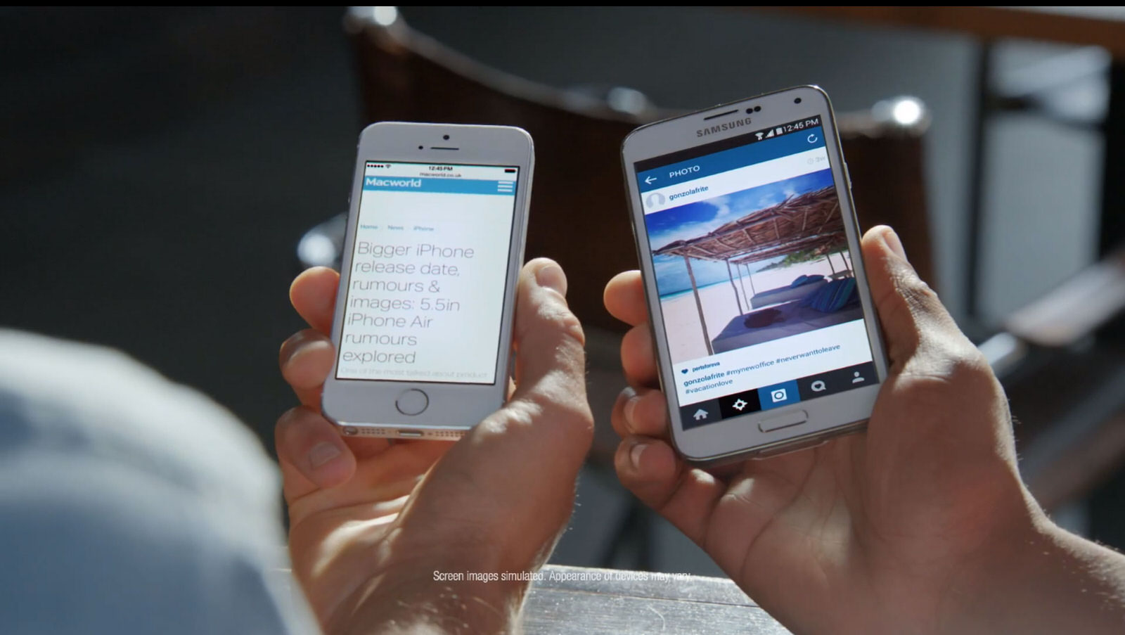 Ammiccando alla legge di freudiana memoria, in uno spot intitolato “Invidia dello schermo”, nell’ultima pubblicità si mostrano due amici seduti ad un bar; di questi uno con un iPhone 5s, fa cenno alle voci sull’iPhone con display maggiorato. L’altro, che maneggia un Galaxy S5, lo guarda stupito e gli rivolge un «ah… ma non ce l’ha ancora?» rendendogli noto, con l’aiuto di una voce fuori campo, che questa realtà che dovrebbe rivoluzionare tutto, per chi ha un telefono Samsung è qualche cosa che ha in casa da due anni a questa parte.