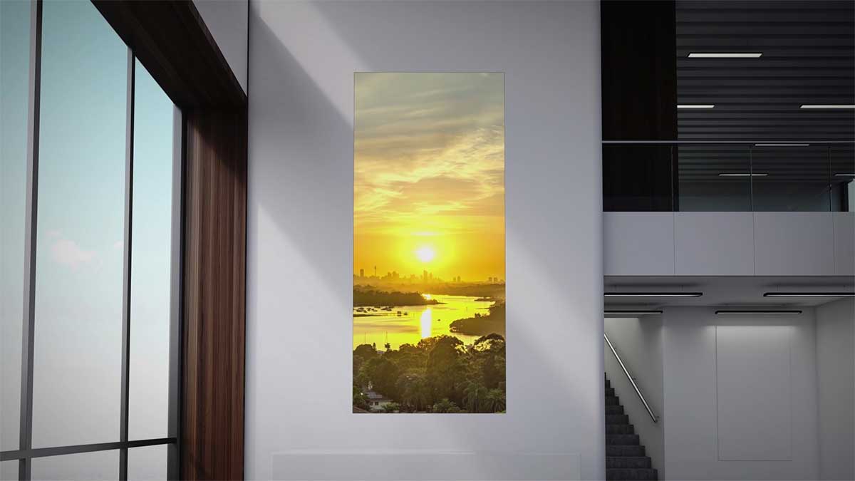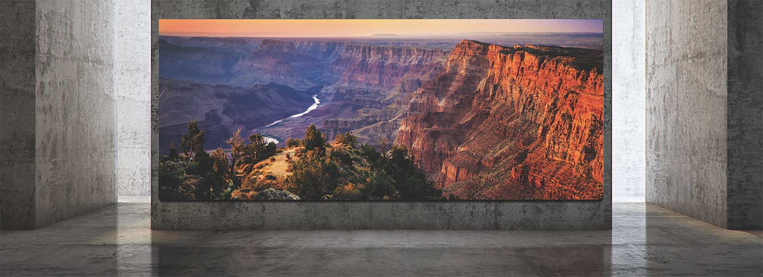 Lo spessore ridotto (meno di 30 mm) e il design privo di cornici consentono al display di integrarsi in qualsiasi spazio. Il produttore indica una durata prevista di circa 100.000 ore per i diodi a emissione automatica. Una funzione denominata “Ambient mode” permette allo schermo di fondersi con l’ambiente circostante – adattandosi al colore o al motivo della parete – oppure di gestire diverse tipologie di contenuti.