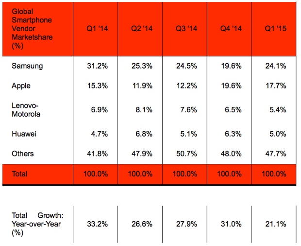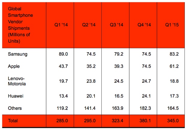 Il podio dei più importanti costruttori di smartphone al mondo è completato da Lenovo-Motorola con 18,8 milioni di terminali e una quota del 5,4% quindi totali e percentuali che si collocano a grande distanza dai primi due. Segue infine Huawei con il 5% del mercato e 17,3 milioni di smartphone. Complessivamente il mercato smartphone è cresciuto del 21% su base annua con un totale di 345 milioni di unità spedite nei primi tre mesi del 2015.