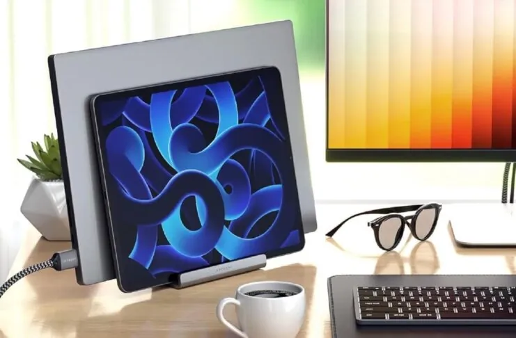 Così, anziché tenere semplicemente il MacBook in verticale, magari nascosto dietro lo schermo, potete affiancarlo a quest’ultimo e inserire un tablet o uno smartphone nell’alloggiamento anteriore, così da avere anche il suo schermo sempre in bella vista.