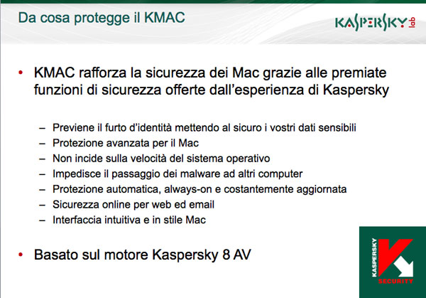 Il risultato è KMac, così come viene indicato in modo abbreviato il nuovo Kaspersky for Mac. Gli esperti di sicurezza interni hanno convertito l’engine Kaspersky che nella sua lunga vita nel mondo PC non solo ha dimostrato la sua efficacia sul campo ma è risultato anche uno dei migliori e più premiati da test indipendenti e da recensioni comparate in diverse riviste del settore.