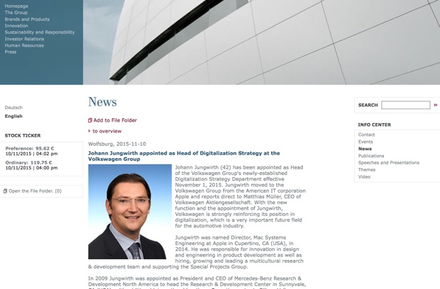 Per risolvere lo scandalo diesel Volkswagen assume il boss di Apple Car. È il colpo di scena che circola in queste ore nel mondo delle auto, quelle attuali ma anche di quelle future. L’annuncio dell’assunzione di Johann Jungwirth arriva direttamente da Volkswagen con un comunicato datato oggi ma in cui si precisa che l’assegnazione dell’incarico all’ex ingegnere Apple risale al primo giorno di novembre. Così dopo Apple a Cupertino, Jungwirth torna nel suo Paese natale per diventare responsabile Digitalization Strategy Department, divisione appena creata in Volkswagen. Il gruppo automobilistico tedesco non fa cenni allo scandalo diesel ma il nuovo ruolo di Jungwirth sembra avere a che fare con tutto ciò che riguarda la digitalizzazione dei veicoli, quindi potenzialmente dalle centraline incriminate per aver camuffato le emissioni inquinanti, fino ad arrivare ai veicoli elettrici e a guida autonoma, che rientrano direttamente nelle competenze dell’ingegnere, appena 42 enne e con alle spalle un curriculum impressionante.