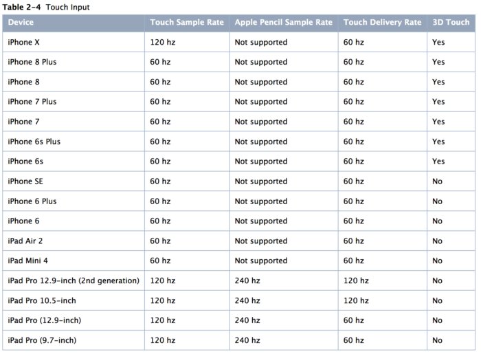 Come si può vedere dalla tabella in alto, diffusa anche per il tramite di Macworld, mentre iPhone 8 e 8 Plus hanno una stessa frequenza di aggiornamento per il Touch Sample e Tocuh Delivery, su iPhone X la frequenza di campionamento del Touch Sample è raddoppiata. Rimane dunque superiore la frequenza di refresh del display sugli ultimi iPad Pro, dove effettivamente si ha un refresh dello schermo fino a 120Hz, con una interfaccia particolarmente fluida nello scrolling, nel panning o nelle operazioni di pinch out e in e non solo.