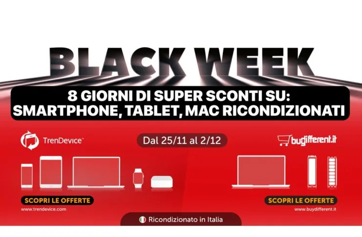 Continuano gli sconti della Black Week di TrenDevice e BuyDifferent, iniziati il 25 Novembre e che termineranno il 2 Dicembre. Grandi offerte su iPhone, Samsung, iPad, Apple Watch, Apple TV e Mac Ricondizionati a prezzi mai visti prima.