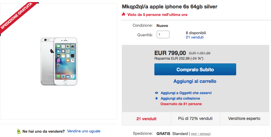 Se invece cercate un iPhone più grande, precisamente da 4,7 pollici, l’occasione da non perdere è quella relativa ad iPhone 6: su eBay la versione da 16 GB, in bianco o neo, viene proposto a 499 euro, con ribasso del 25% circa. I telefoni sono tutti coperti da garanzia 24 mesi, sono completamente compatibili con le nostre reti e sono nuovi, con garanzia 24 mesi. Il design è identico a quello dei nuovi iPhone 6s, mentre a livello di prestazioni non ha davvero nulla che invidiare ad altri terminali più recenti. Il venditore è GlobalTelephone, una azienda italiana molto seria, raccomandata da eBay e con un elevatissimo numero di giudizi positivi: 99.6%.