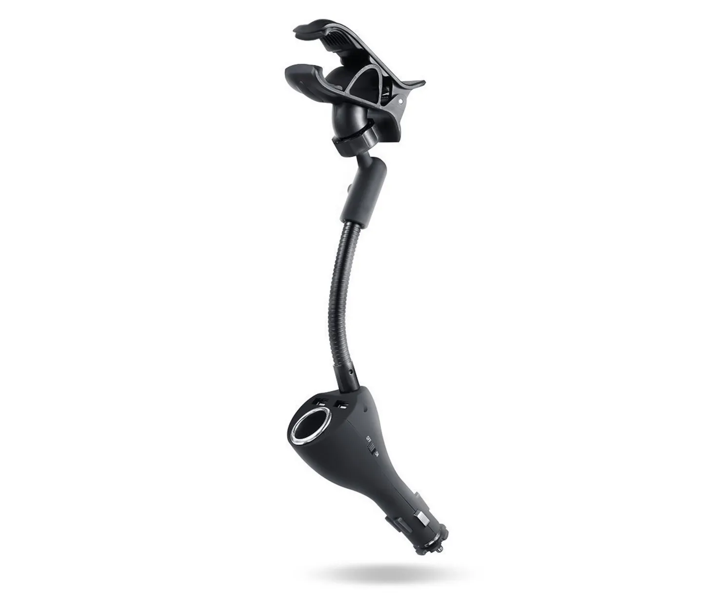 Si tratta di un caricatore da auto dotato di braccio metallico con una pinza all’estremità che funge da supporto per lo smartphone. Funziona con qualsiasi telefono, anche un phablet da 5,5 pollici con custodia annessa, che può essere ricaricato collegando il cavetto nell’apposita presa USB incorporata sul caricatore.