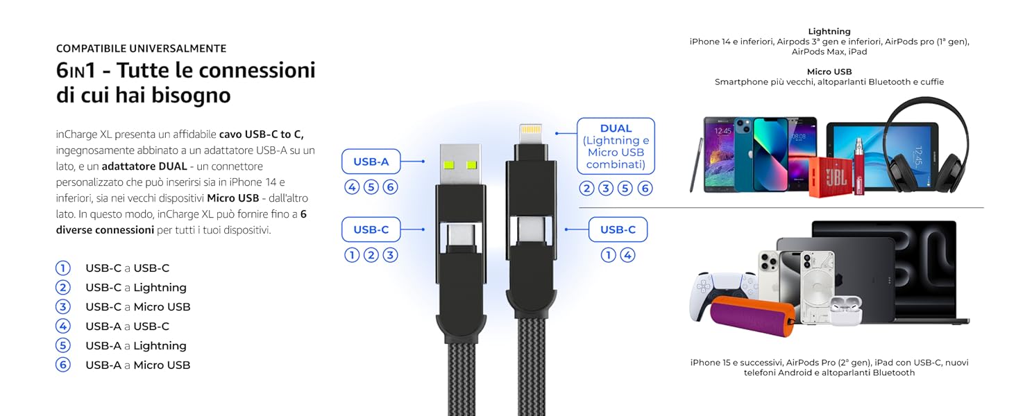 Si tratta di un 6-in-1 molto ben costruito che offre un connettore Cavo Lightning, un connettore USB-A, USB-C, e Micro USB. Come detto si tratta di un vero cavo universale.