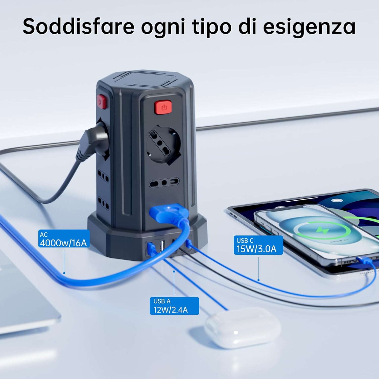 Con questa torretta, in pratica, potete alimentare fino a 12 dispositivi anche ad elevata potenza. L’uscita massima è di 4000 Watt (10 A), il tutto occupando una una sola presa di corrente.